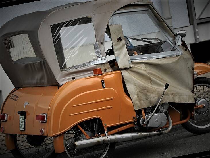 Mit diesem Fahrzeug kann ich nach dem Einigungsvertrag mit bis 60 km/h zwischen Mannheim und Überlingen fahren mit der Gastschwester. Das darf auch mit 45 km/h gefahren werden. Dieses Fahrzeug wird nur für Fernstrecken verwendet. Ein Elektobausatz wird vorgesehen, wenn Benzin nicht mehr verkauft wird. Damit würde auch die 60km/h erlöschen nach dem Einigungsvertrag, Der Dachbezug ist inzwischen über die Näherei erneuert und von unserer KFZ-Werkstatt montiert. Der Verbrauch liegt bei etwa 3,4 Liter 2Tankt-Gemisch 1:45
